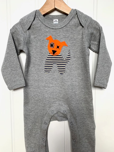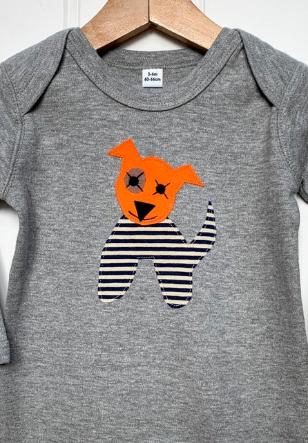 This lovely soft great melange Baby Dog sleepsuit features a cheeky dog on the front with a waggy tail and patch eye.